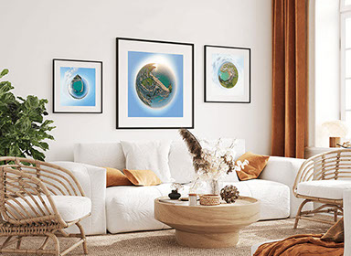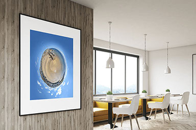 As a fully-licensed UAV pilot I use a professional drone to capture multiple high resolution aerial photos of each location which are later digitally stitched together to form a sphere, a tiny planet, that is both familiar and otherworldly.