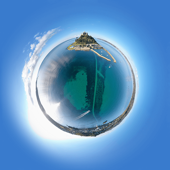 This image was created from an array of 26 high resolution photos taken from a professional drone as the sun came up over Mount's Bay. The photos were then digitally stitched together to form a 'tiny planet.'